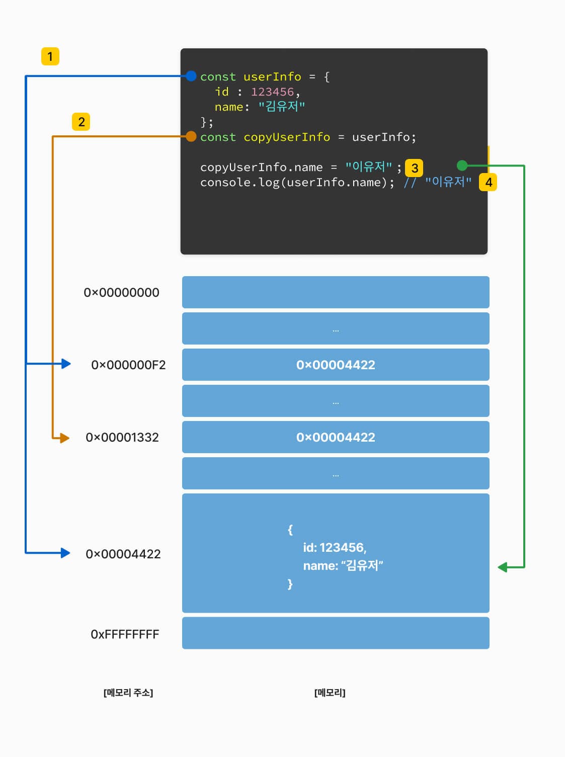 javascript const userInfo = { id: 1, name: "김유저", }; const copyUserInfo = userInfo; copyUserInfo.name = "이유저"; // 복사한 객체에서 데이터 수정 console.log(userInfo.name) // "이유저", 복사한 객체를 수정하였지만 원본 객체도 수정되었다!